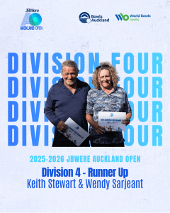 Division Two was claimed by Jeanine Browne and Billy Fulton (Riverhead), who defeated Agnes and David Motu 18–8. The victory came during an emotional weekend following the passing of Agnes’ life partner Mike Bradshaw, with the bowls community gathering the day prior to celebrate his life.