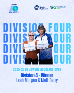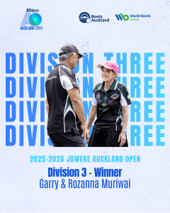 Division Two was claimed by Jeanine Browne and Billy Fulton (Riverhead), who defeated Agnes and David Motu 18–8. The victory came during an emotional weekend following the passing of Agnes’ life partner Mike Bradshaw, with the bowls community gathering the day prior to celebrate his life.